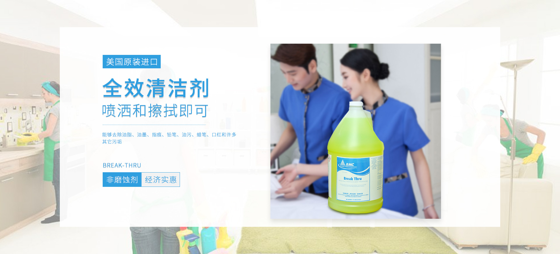 新朗環(huán)境自2015年起與美國具百年歷史的跨國企業(yè)RMC(Rochester Midland Corporation)合作, 進(jìn)口 RMC用于機(jī)械制造、交通運(yùn)輸、航天航空、石油化工、食品禽肉乳制品加工等工業(yè)生產(chǎn)制造行業(yè)的專業(yè)清洗、滅菌系列產(chǎn)品,以及酒店、CBD大廈、學(xué)校(包括幼稚園)、醫(yī)療機(jī)構(gòu)、百貨商場、養(yǎng)殖業(yè)、餐飲業(yè)等商用行業(yè)清潔、消毒系列產(chǎn)品,還有專用于各個(gè)行業(yè)單位“廁所革命”的公共衛(wèi)生間根源除味第5代SANOR?衛(wèi)生間自動(dòng)滴管系統(tǒng)、第6代百屋潔SIOGIENIUS?電子控制衛(wèi)生間自動(dòng)滴注系統(tǒng)等系列產(chǎn)品項(xiàng)目。